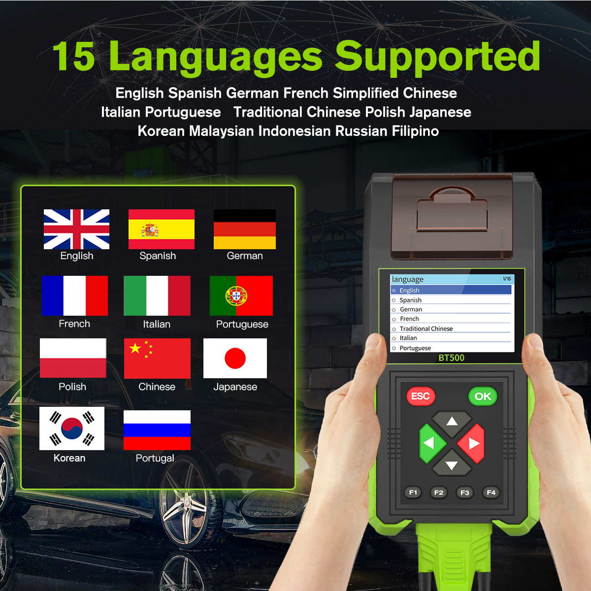 The BT500 represents the next generation of multifunctional battery analyzers, featuring a premium, sophisticated design and enhanced functionality. Its large 3.5-inch display ensures clear visibility, while the built-in temperature sensor continuously monitors ambient conditions for more precise testing results. Newly added data printing capabilities complement existing features including leakage current detection, relay testing, load testing, charging system evaluation, and starting system assessment. Supports language switching. Power clamp leads, leakage detection leads