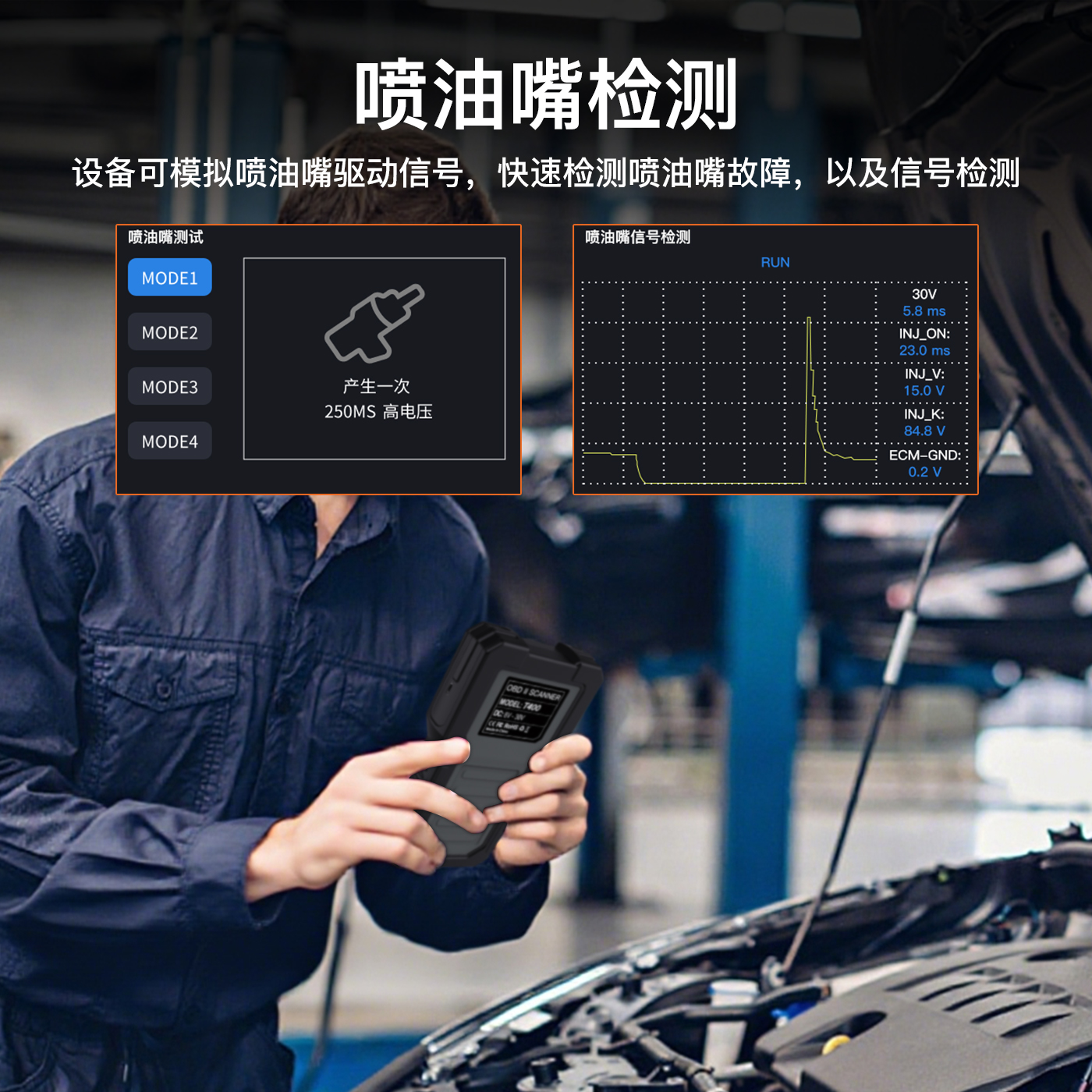 多功能三合一扫描仪 ,T400 适用于所有符合 OBDII协议的汽车和摩托车(可匹配车型高达 97%)支持信号模拟,喷油嘴检测,继电器检测,电池寿命诊断、云打印、故障码查询、读取车辆信息、查看实时数据流、读取故障码、清除故障码I/M 就绪测试等, 是汽车维修工具的最佳选择。